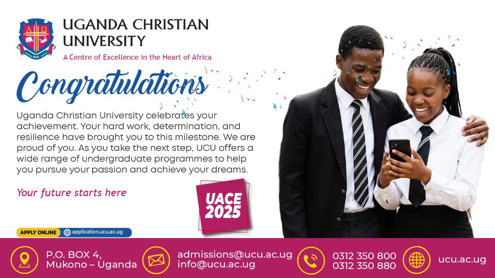 We are honoured that you are considering Uganda Christian University (UCU) for your higher Education. Our admissions process is designed to be straight forward and accessible, ensuring that all prospective students have the opportunity to join our vibrant community.